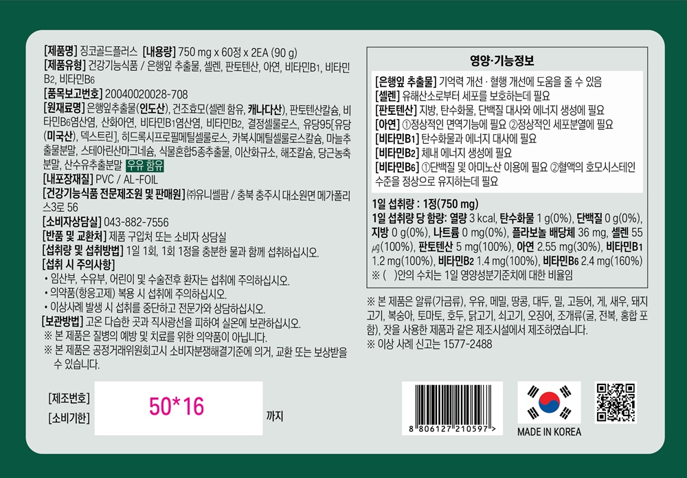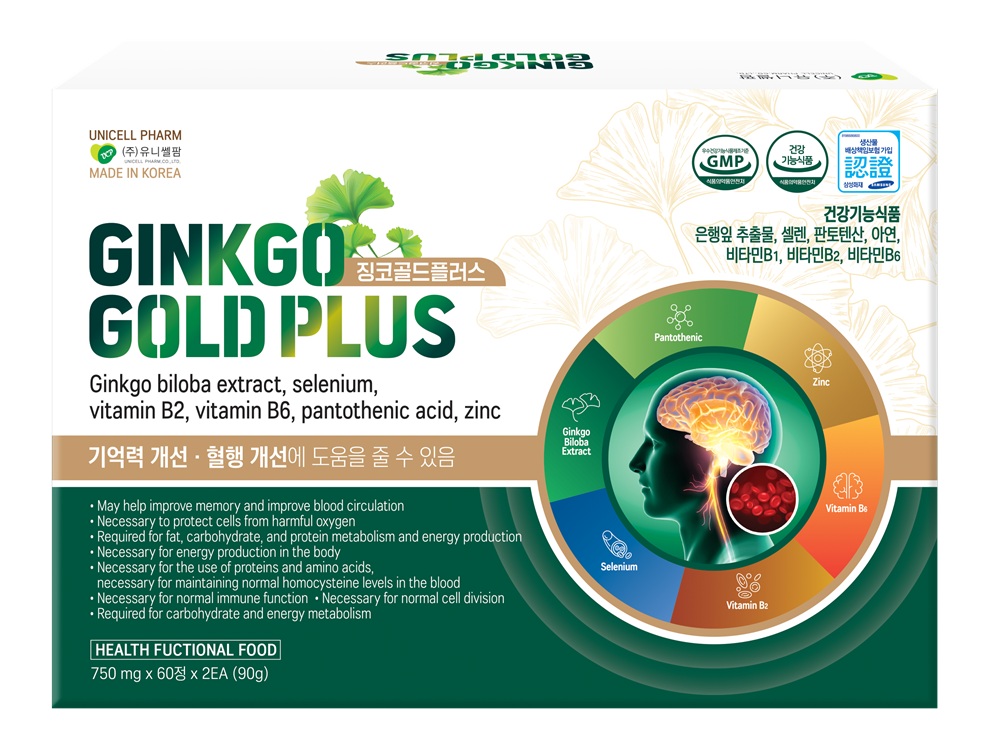 은행잎추출물(인도산), 건조효모(셀렌 함유, 캐나다산), 판토텐산칼슘, 비타민B6염산염, 산화아연, 비타민B1염산염, 비타민B2, 결정셀룰로스, 유당95[유당(미국산),덱스트린], 히드록시프로필메틸셀룰로스, 카복시메틸셀룰로스칼슘, 마늘추출분말, 스테아린산마그네슘, 식물혼합5종추출물, 이산화규소, 해조칼슘, 당근농축분말, 산수유추출분말 우유함유